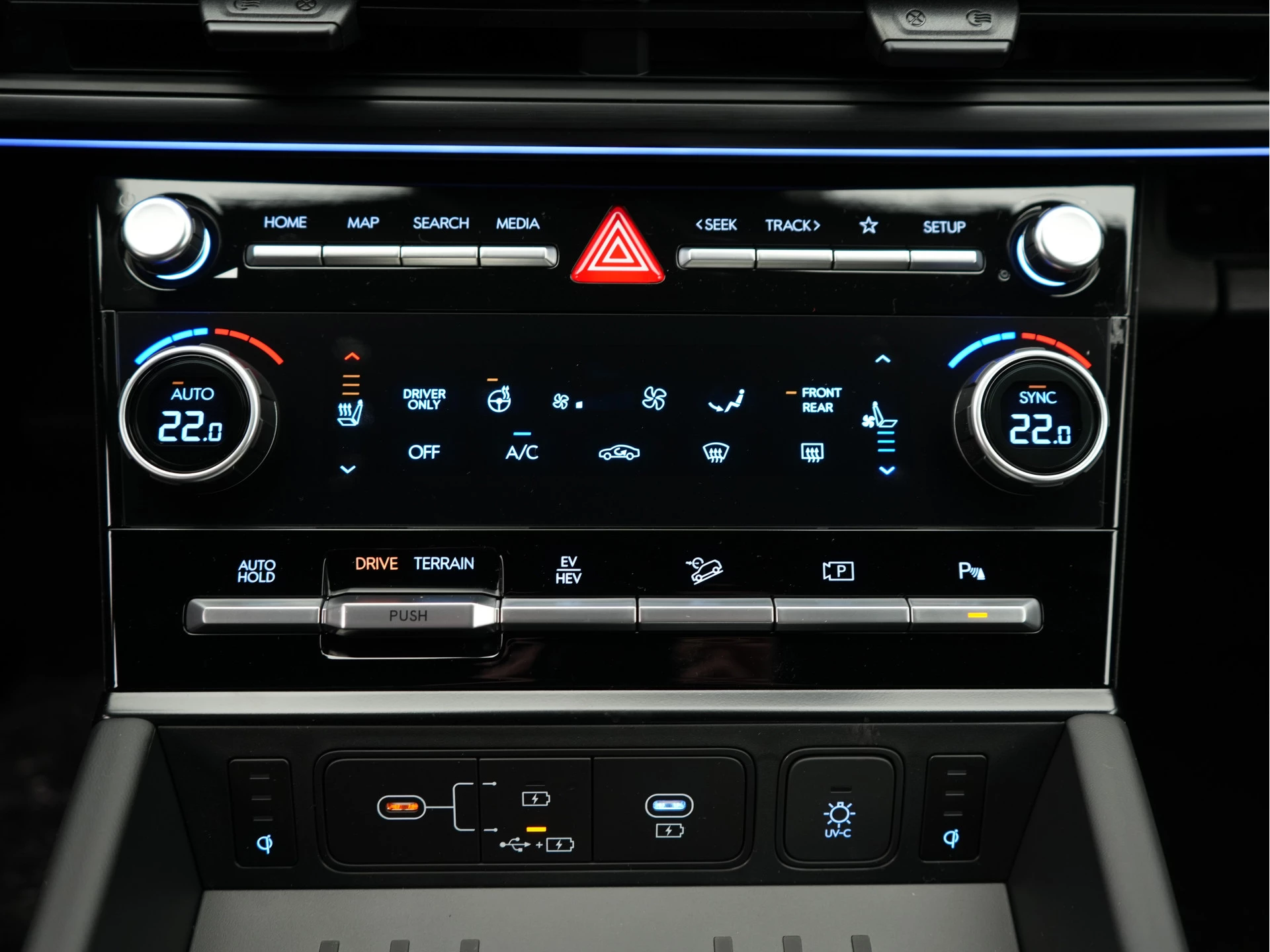 In deze auto zijn verschillende technologieën aanwezig die voor jou het verkeer en de omgeving in de gaten houden en die desnoods ook kunnen remmen of bijsturen. Je hoeft onderweg je hoofd nooit te draaien of je blik te verplaatsen om dashboard-info af te lezen. De head-up display projecteert alles op de voorruit. Je kunt rijden als een jachtpiloot. Verkeersbord-detectie herkent verkeersborden en toont deze op het instrumentarium van de auto. Het Lane-keeping systeem zorgt dat je mooi binnen de lijntjes blijft. Ongemerkt buiten de rijstrook komen is er niet meer bij. Bovenop deze veiligheidsfeatures heeft deze Hyundai bovendien dodehoekdetector detectiesysteem, hill hold functie, vermoeidheidsherkenning, autonoom remsysteem en bandenspanningcontrolesysteem.