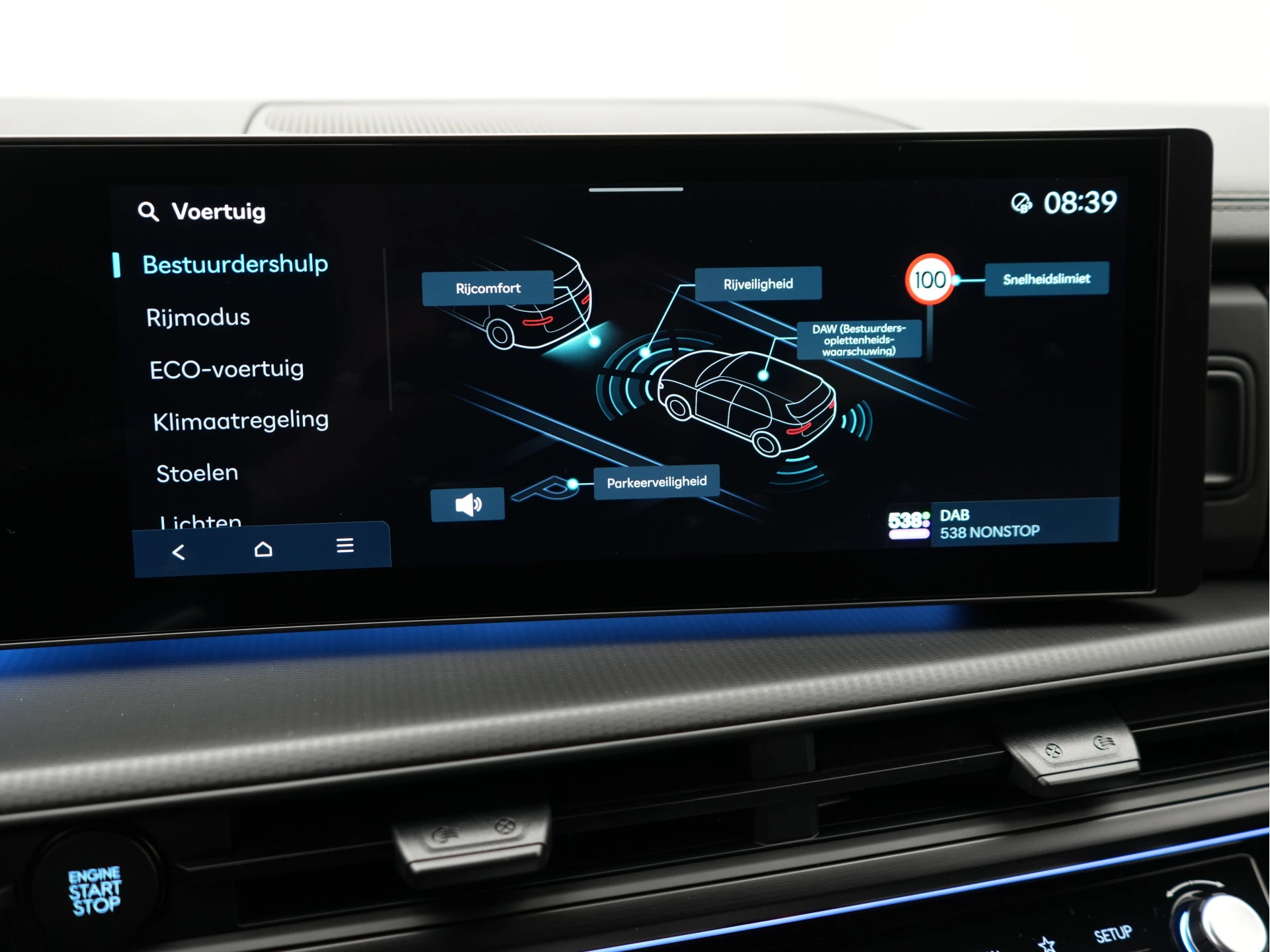 Rijfuncties worden glashelder en overzichtelijk weergegeven via het digitale dashboard. De vier camera's die samen de 360 graden camera vormen, bieden je de mogelijkheid om obstakels in elke richting te zien. Als je de adaptive cruise control inschakelt, regelt de auto zelf de snelheid en de afstand tot de auto voor je. Intelligente spraakbediening herkent jouw commando's en voert opdrachten snel en soepel uit. De speciale app verbindt met Connected Services, die de status van vitale functies bijhoudt en waarschuwt als je bijvoorbeeld moet tanken, de bandenspanning moet controleren of olie moet bijvullen. En deze auto heeft ook premium audiosysteem, navigatiesysteem, kruisend verkeer detectie, automatische airconditioning, draadloos opladen en DAB ontvangst als standaard uitrusting.