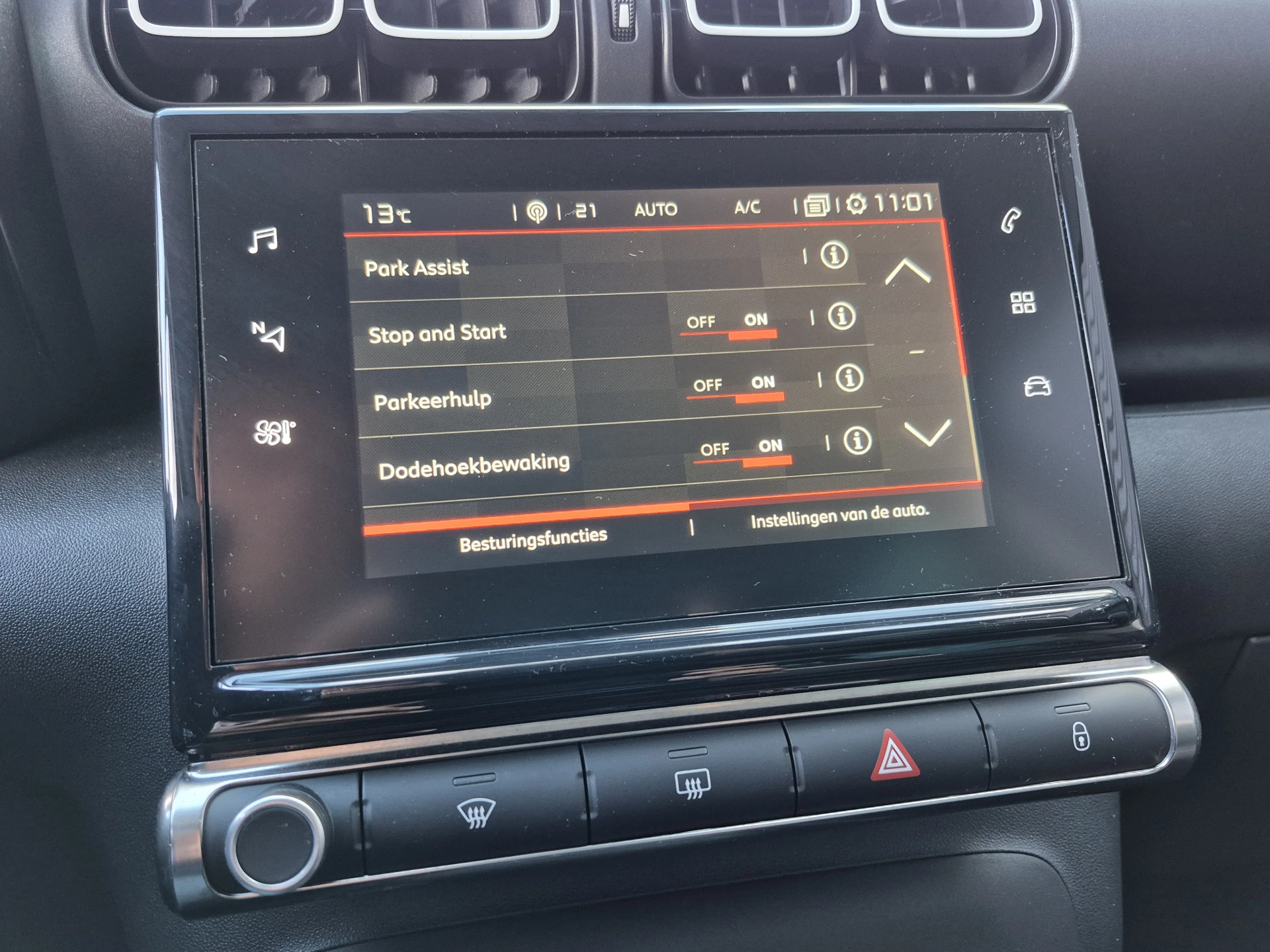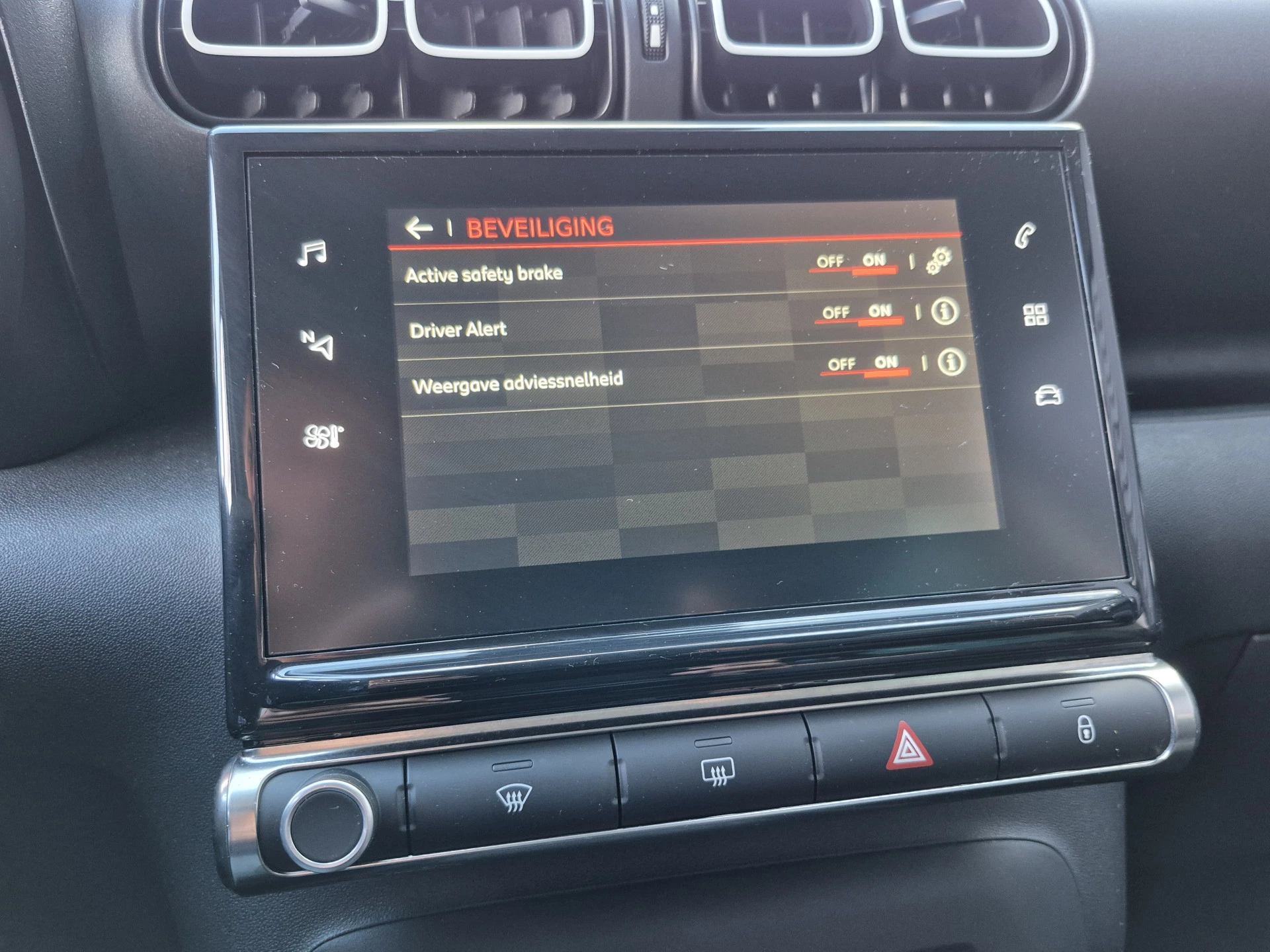 In de Citroën C3 Aircross heeft jouw veiligheid en die van jouw omgeving prioriteit. In het instrumentarium laat de verkeersborddetectie de actuele verkeersborden zien. Onbedoeld buiten de rijstrook raken wordt voorkomen door het Lane-keeping systeem. De forward collision warning reduceert het gevaar van een botsing met een voorligger significant. Dankzij veiligheidsvoorzieningen als hill hold functie, brake assist, vermoeidheidsherkenning en bandenspanningcontrolesysteem, ben je steeds veilig onderweg.
