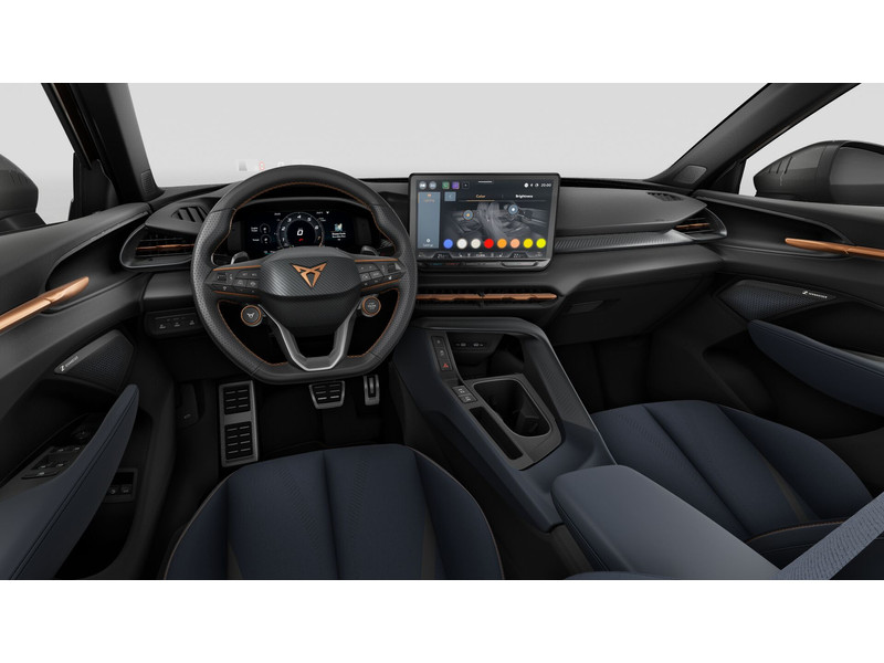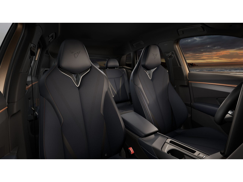 InterieurAutomatisch dimmende binnenspiegelBekleding stof ''Deep Ocean''Bestuurdersstoel en bijrijdersstoel in hoogte verstelbaarDakhemel uitgevoerd in zwartFrames om luchtuitstroomroosters in Copper en Dark AluminiumKuipstoelen vóór met geïntegreerde hoofdsteunLendesteunverstelling voorstoelen handmatigMattenset CUPRA, uitgevoerd in blauw (Deep Ocean)Multifunctioneel verwarmbaar stuurwiel met start–en CUPRA–knop en schakelpaddelsSportpedalen, uitgevoerd in aluminiumSupersport stuurwiel in CUPRA design