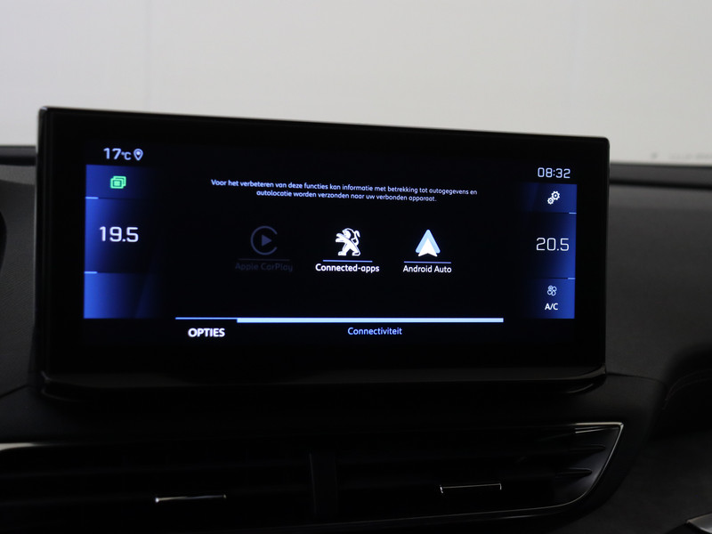 Omdat goed geïnformeerd rijden tegenwoordig om veel meer draait dan alleen snelheid en brandstofpeil, laat het digitale dashboard alle functies zien die je nodig hebt. Adaptive cruise control houdt de ingestelde snelheid vast en houdt afstand tot het voertuig voor je. Je smartphone wordt een dashboard, met alle functies in beeld. Dankzij Connected Services en de speciale app. Het audiosysteem en het full map navigatiesysteem bedien je veilig met knoppen op het stuurwiel of met gesproken commando's. Ook is de auto voorzien van automatische airconditioning. De Peugeot is standaard voorzien van: parkeersensoren achter, regensensor, sportstuurwiel, keyless entry, automatisch dimmende binnenspiegel en centrale deurvergrendeling met afstandsbediening.