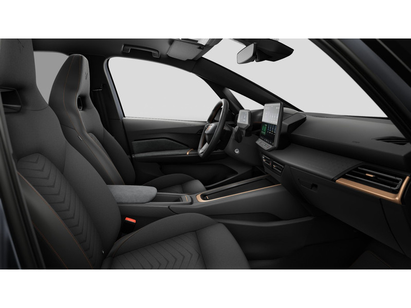 InterieurAutomatisch dimmende binnenspiegelBestuurdersstoel in hoogte verstelbaarInleg deurbekleding in Dinamica (suede look)Kuipstoelen vóór, stof Black Seaqual CottonMattenset CUPRA, uitgevoerd in zwartMiddenarmsteun voor, middenconsole met afsluitbaar opbergvakMultifunctioneel verwarmbaar stuurwiel met CUPRA- & mode-knopRugleuning achterbank in delen neerklapbaarSportpedalen, uitgevoerd in aluminiumStuurwiel in CUPRA design