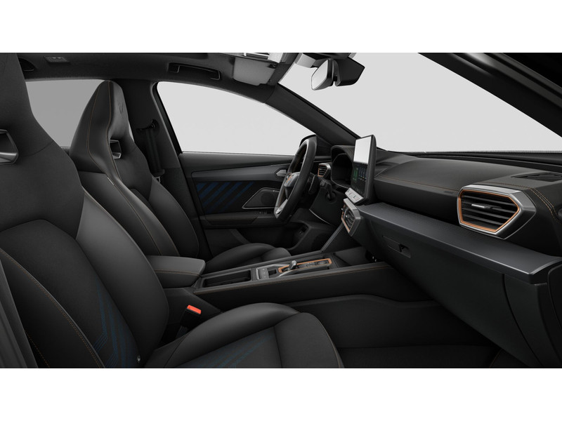 InterieurAutomatisch dimmende binnenspiegelBekleding stof Black SoulBestuurdersstoel en bijrijdersstoel in hoogte verstelbaarDakhemel uitgevoerd in zwartDinamica (suede-look)Frames om luchtuitstroomroosters in Copper en Dark AluminiumLendesteunverstelling voorstoelen handmatigMattenset CUPRA, uitgevoerd in zwartMultifunctioneel verwarmbaar stuurwiel met start–en CUPRA–knop en schakelpaddelsSportpedalen, uitgevoerd in aluminiumSupersport stuurwiel in CUPRA design