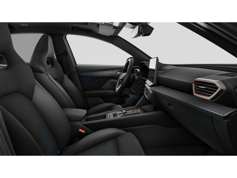 InterieurAutomatisch dimmende binnenspiegelBekleding Dinamica en CUPRA logo in hoofdsteunBestuurdersstoel en bijrijdersstoel in hoogte verstelbaarDakhemel uitgevoerd in zwartFrames om luchtuitstroomroosters in Copper en Dark AluminiumKuipstoelen vóór met geïntegreerde hoofdsteunLendesteunverstelling bestuurdersstoel elektrischMattenset CUPRA, uitgevoerd in zwartMultifunctioneel verwarmbaar stuurwiel met start–en CUPRA–knop en schakelpaddelsSportpedalen, uitgevoerd in aluminiumSupersport stuurwiel in CUPRA design