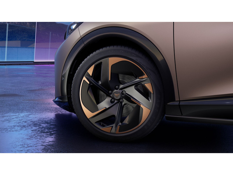 SportonderstelBanden 255/40 R21Buitenspiegels in Mythos Black/Dolphin Grey (afh.van ext.kleur)Donker getinte ruiten achter (vanaf B-stijl)Instaplijst (verlicht) aluminiumKoplampverlichting Matrix LED in signature vormLED-achterlichten, doorlopend over gehele breedtePanoramadak (panoramisch glazen dak, kan niet open)SlotboutenVelgen 'Katla Copper', 21 inch lichtmetaalVerlicht CUPRA logo op motorkapWelkomsverlichting "CUPRA" en welkomsceremonie achterlichten