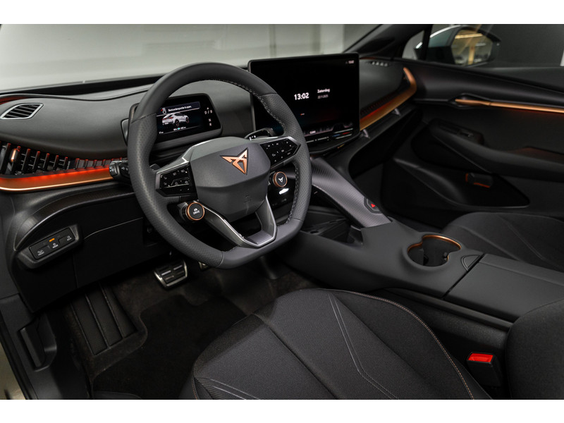 InterieurMultifunctioneel verwarmbaar stuurwiel met start- & CUPRA-knopAutomatisch dimmende binnenspiegelBestuurdersstoel en bijrijdersstoel manueel verstelbaarInleg deurbekleding in DinamicaKuipstoelen vóór, stof Soul BlackLED sfeerverlichting in portieren, voetenruimte, dashboard & middenconsoleMattenset CUPRA, uitgevoerd in zwartMiddenconsole met opbergvakRugleuning achterbank in delen neerklapbaarSportpedalen, uitgevoerd in aluminium