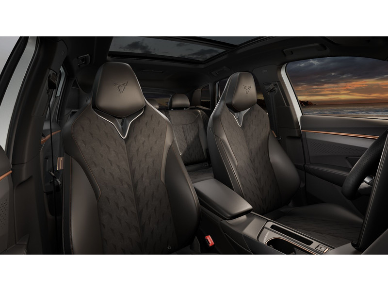 InterieurAutomatisch dimmende binnenspiegelBestuurdersstoel en bijrijdersstoel in hoogte verstelbaarDakhemel uitgevoerd in zwartFrames om luchtuitstroomroosters in Copper en Dark AluminiumKuipstoelen vóór met geïntegreerde hoofdsteunLendesteunverstelling voorstoelen handmatigMattenset CUPRA, uitgevoerd in blauw (Deep Ocean)Moon Light (suede-look)Multifunctioneel verwarmbaar stuurwiel met start–en CUPRA–knop en schakelpaddelsSportpedalen, uitgevoerd in aluminiumSupersport stuurwiel in CUPRA design