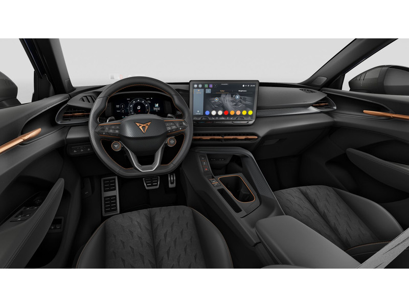 InterieurAutomatisch dimmende binnenspiegelBestuurdersstoel en bijrijdersstoel in hoogte verstelbaarDakhemel uitgevoerd in zwartFrames om luchtuitstroomroosters in Copper en Dark AluminiumKuipstoelen vóór met geïntegreerde hoofdsteunLendesteunverstelling voorstoelen handmatigMattenset CUPRA, uitgevoerd in blauw (Deep Ocean)Moon Light (suede-look)Multifunctioneel verwarmbaar stuurwiel met start–en CUPRA–knop en schakelpaddelsSportpedalen, uitgevoerd in aluminiumSupersport stuurwiel in CUPRA design