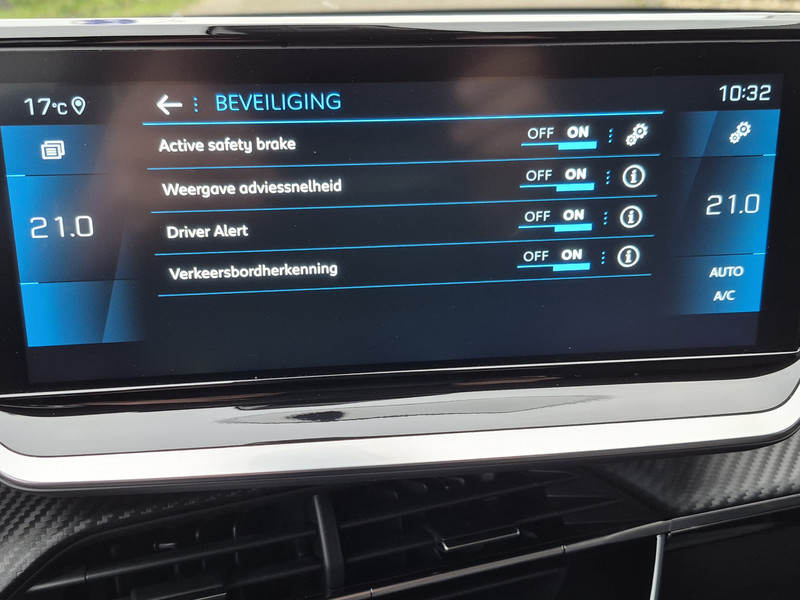 Deze Peugeot biedt je niet alleen comfort en rijplezier, maar ook veiligheid. Actieve veiligheidssystemen houden voor jou de weg in de gaten en reageren op onvoorziene situaties voordat jij dat kunt. Een belangrijke bijdrage aan de veiligheid onderweg levert de verkeersbord-detectie. Voorzien van het Lane-keeping systeem. Ofwel: blijf automatisch in je baan. De forward collision warning reduceert het gevaar van een botsing met een voorligger significant. Ook helpen het hill hold functie, brake assist, vermoeidheidsherkenning en bandenspanningcontrolesysteem, jouw rit tot een veilige rit te maken.