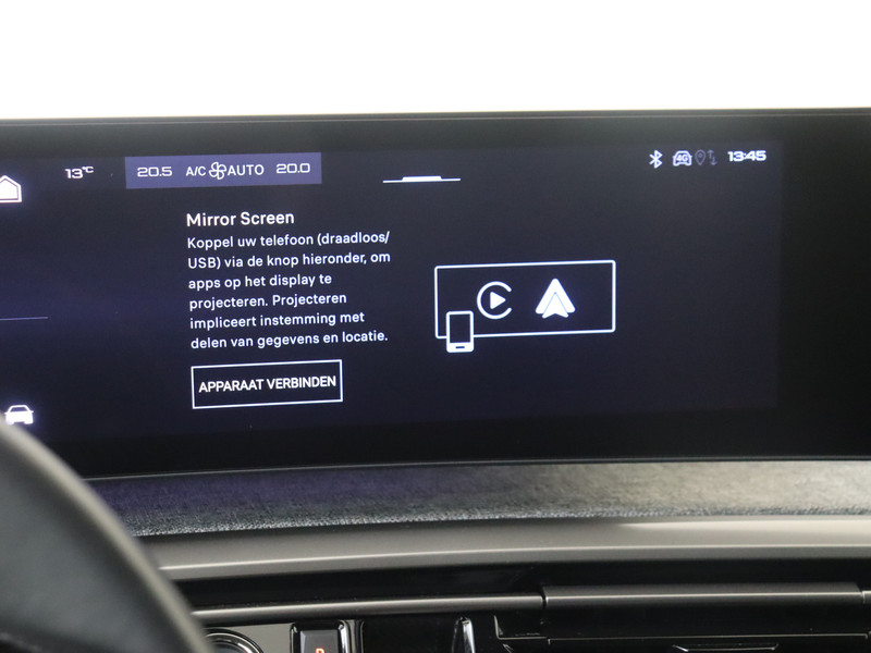 Snelheid, brandstofinfo, noem maar op. Het digitale dashboard houdt je permanent op de hoogte. Goed en overzichtelijk. Met de 360 graden camera op deze auto wordt het rijden een heel stuk veiliger, dankzij het optimale zicht dat het biedt. Met adaptive cruise control houdt de auto zelfstandig afstand tot jouw voorligger. Een veiligheidsverhogende optie waarmee je comfortabel onderweg bent. Het infotainmentsysteem bedien je met je vingers of met je stem, met dank aan de geïntegreerde stembediening. Handig en veilig: Connected Services. Alle vitale functies en data van de auto check je via de app op je smartphone. De uitrusting van deze Peugeot is met navigatiesysteem, electronic climate control, draadloos opladen, DAB ontvangst, regensensor en keyless entry behoorlijk compleet.