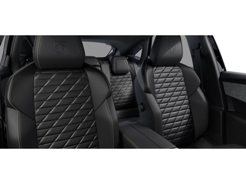 InterieurAchterbank met gedeeld (40:20:40) neerklapbare rugleuningCompact met leder bekleed stuurwiel met in glanzend zwart uitgevoerde geïntegreerde bedieningsknoppen, decoraties in Stene GreyCRISPY-stofmet reliëf, Isabella TEP, RIMINI-sjaal van gemêleerde stof, Quartz-stikselsLeder NAPPA zwart MistralMiddenconsole bekleed met gemêleerde stof RIMINI, glanzend zwart frontpaneel , strip in Stene Grey en armleuning bekleed met gemêleerde stof RIMINIPEUGEOT Panoramic i Cockpit® met zwevend dubbel HD scherm (2 x 10'') StijlelementenPortierbekleding in gemêleerde stof RIMINI, bergruimte in grafeen en strip in Stene Grey, kunstleder armsteunen voorin afgewerkt met stikselVóórstoelen handmatig in hoogte verstelbaarZacht dashboard bekleed met gemêleerde stof RIMINI en open bergruimte in grafeen , glanzend zwart voorpaneel en ventilatieopeningen met decoratie in Stene GreyZwart interieur en zwarte hemelbekleding