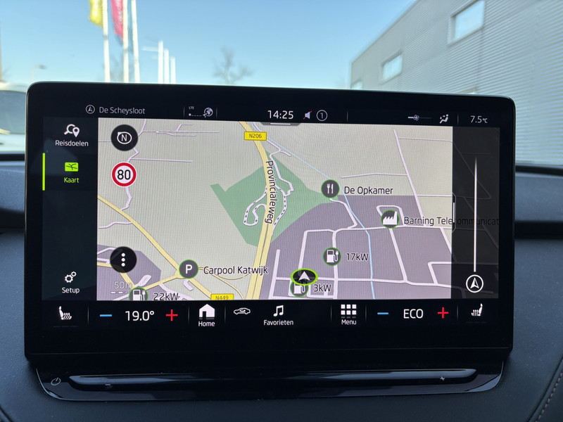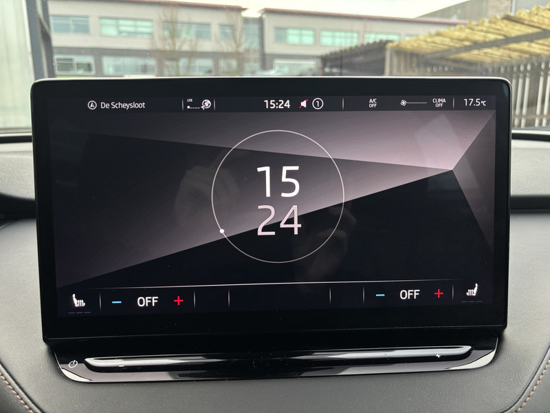 De nieuwste veiligheidssystemen komen in deze ŠKODA Enyaq iV samen. In het instrumentarium laat de verkeersborddetectie de actuele verkeersborden zien. Een camera houdt de juiste koers binnen de rijstrook in de gaten en het Lane-keeping systeem corrigeert bij afwijkingen. Forward collision warning waarschuwt bij een dreigende aanrijding en vermindert de gevolgen van een ongeval. Ook helpen het dodehoekdetectie, vermoeidheidsherkenning, autonoom remsysteem en bandenspanningcontrolesysteem, jouw rit tot een veilige rit te maken.