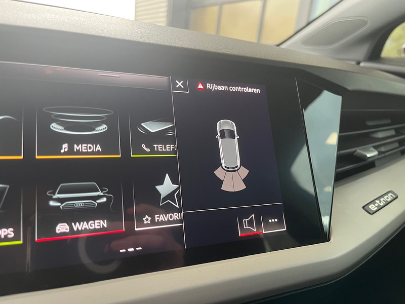 Deze Audi Q4 e-tron is ook behulpzaam als het gaat om een rechte koers. Het Lane-keeping systeem signaleert en corrigeert als je onbedoeld de rijstrooklijnen dreigt te overschrijden.