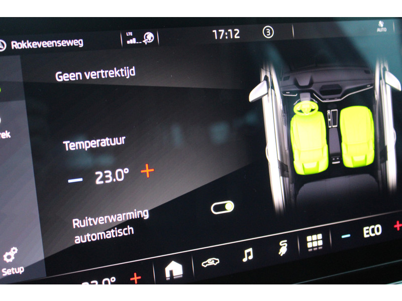 Zoals je mag verwachten van deze ŠKODA Enyaq iV is hij uitgerust met een reeks aan actieve veiligheidssystemen. Indien je onbedoeld de rijstrook lijkt te verlaten, reageert het Lane-keeping systeem meteen en corrigeert. De sensor van het forward collision warning-systeem registreert permanent de afstand tot voorliggers en grijpt in als een botsing dreigt. Je bent mede dankzij dodehoekdetectie, autonoom remsysteem en bandenspanningcontrolesysteem steeds veilig onderweg.